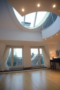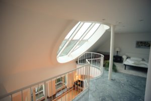 Die Treppe führt Sie weiter in die dritte Ebene der Wohnung, dem Dachgeschoss. Diese ist als Galerie offen gestaltet, mit großen Fensterflächen und einem atemberaubenden Blick über Düsseldorf.