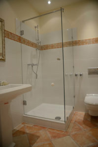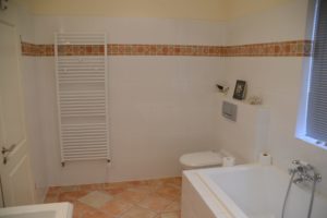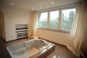 Durch eine große 2-flügelige Tür erreichen Sie von Wohnzimmer aus den Schlafbereich. Vor dem Bad befindet sich ein Ankleidebereich (begehbarer Kleiderschrank), darauf folgt ein großes Bad mit Badewanne, 2 Waschtischen, Dusche und WC. Das Badezimmer ist mit neuen Villeroy & Boch Objekten im Stil der Jahrhundertwende ausgestattet und wirkt sehr edel.