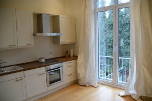 Daran gliedert sich eine Küche mit einer gehobenen-neuen Einbauküche.