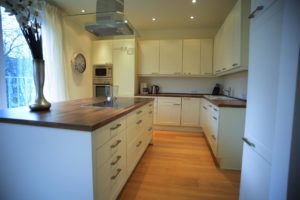 Extrem hohe Decken (3,25m) mit Einbaustrahlern, Echtholz Eichen Parkett/Dielenfußboden mit Fußbodenheizung Gespachtelte Wände, Luxus Einbauküche mit allen Geräten, Terrasse mit Hartholzbelag