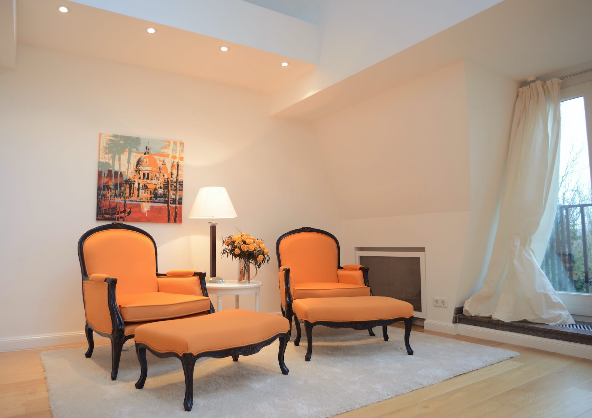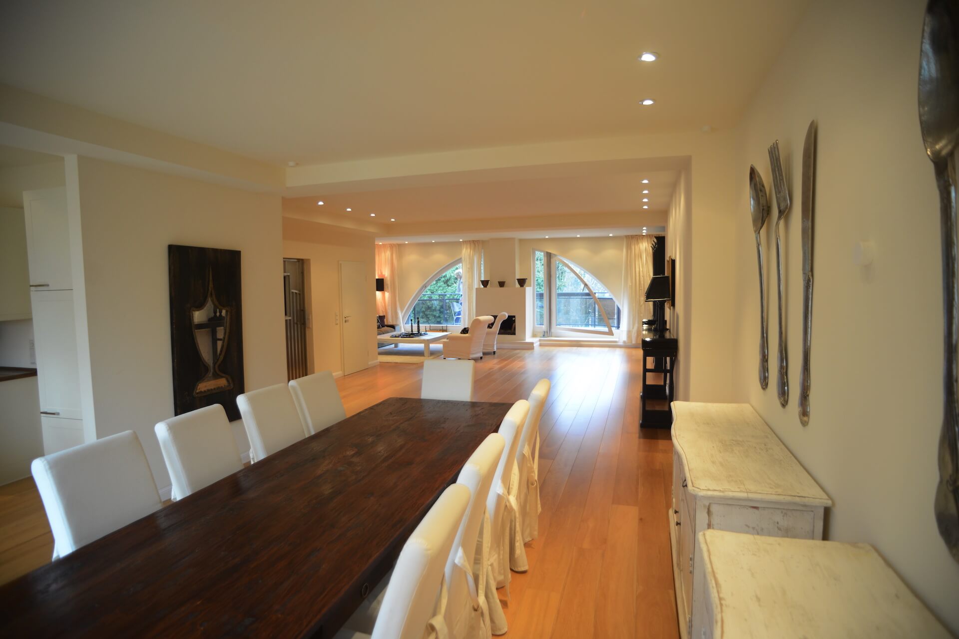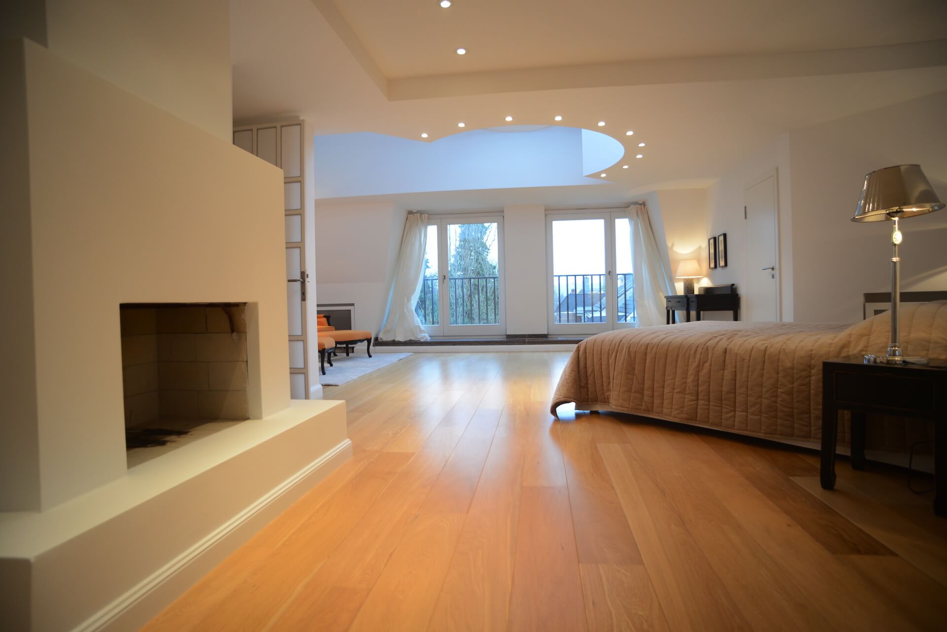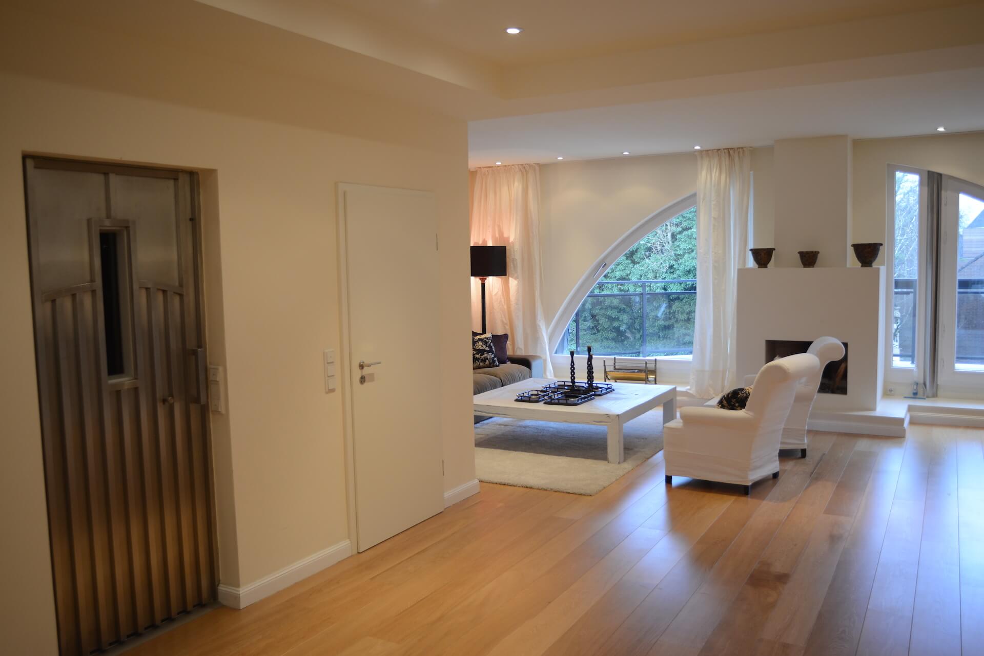 Echtholz Elchen Parkett, Dielenfußboden mit Fußbodenheizung, Gespachtelte Wände, Luxus-Einbauküche, 2 Kamine, 2 Balkone, Galerie, Luxus-Wellnessbereich, Sauna, Aufzug innerhalb des Hauses bis in die Wohnung.