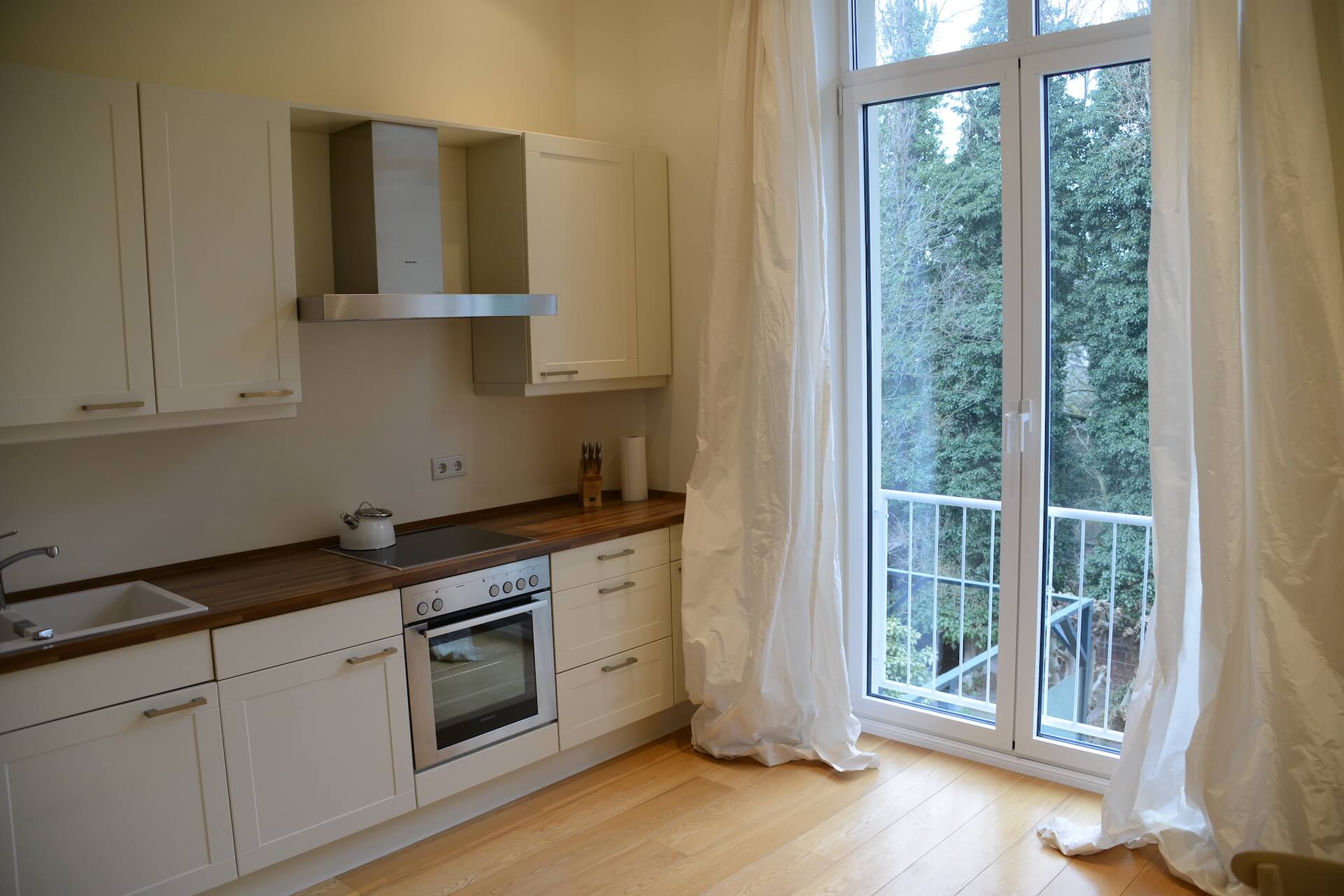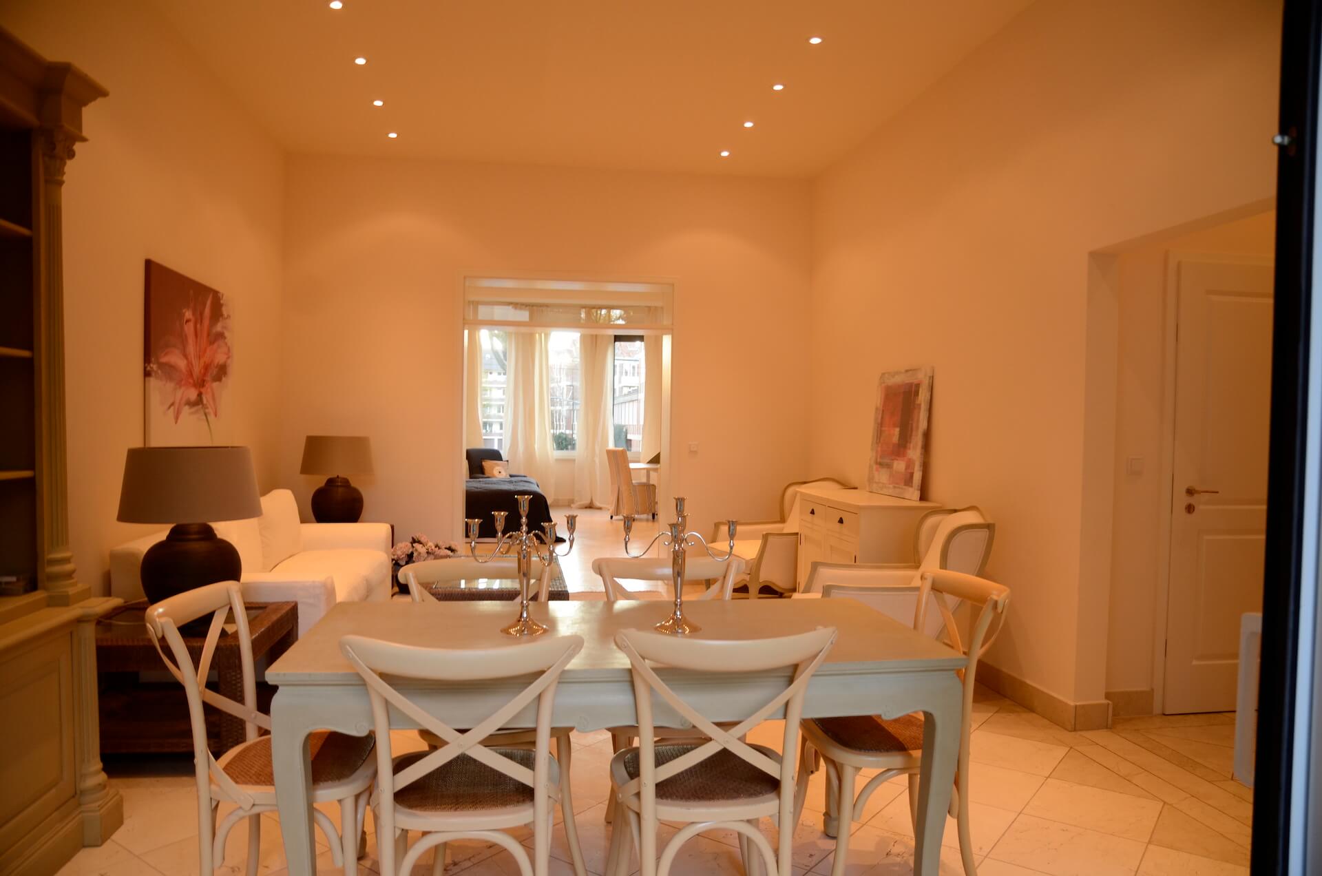 Extrem hohe Decken (3,25m) mit Einbaustrahlern, Speziell gealterter(getrommelter) Marmorfußboden mit Fußbodenheizung, Gespachtelte Wände, Luxus Einbauküche mit allen Geräten, Terrasse mit Hartholzbelag