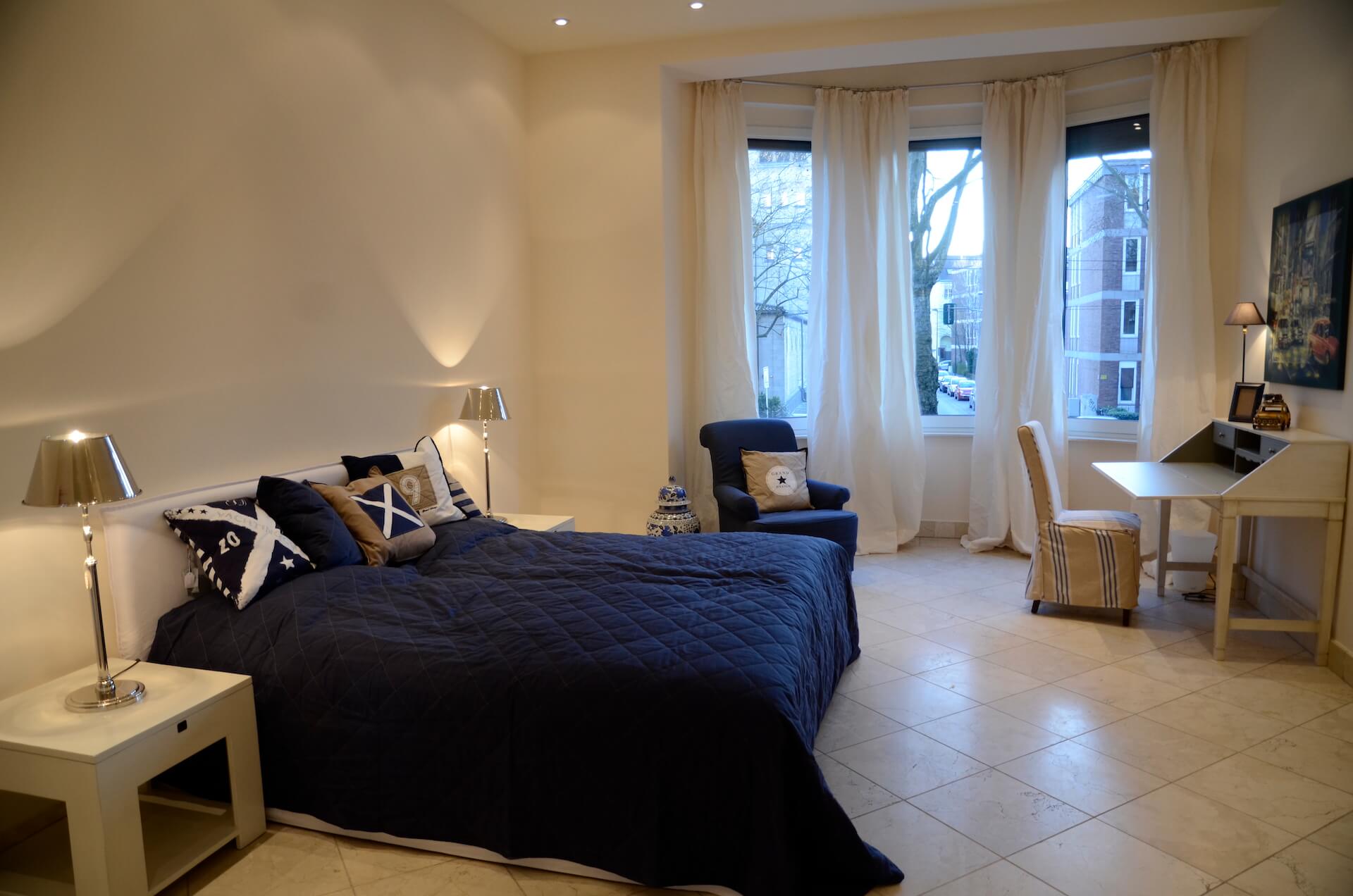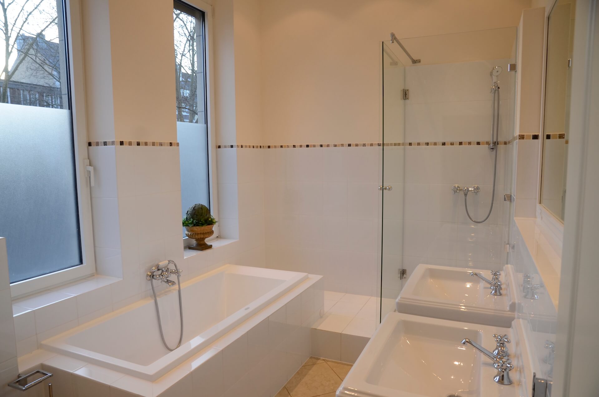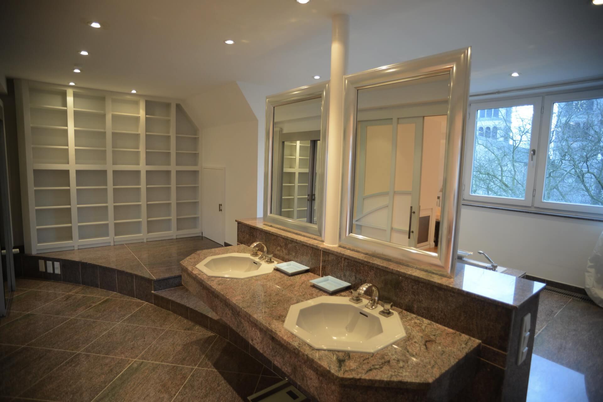 Durch eine große 2-flügelige Tür erreichen Sie von Wohnzimmer aus den Schlafbereich. Vor dem Bad befindet sich ein Ankleidebereich (begehbarer Kleiderschrank), darauf folgt ein großes Bad mit Badewanne, 2 Waschtischen, Dusche und WC. Das Badezimmer ist mit neuen Villeroy & Boch Objekten im Stil der Jahrhundertwende ausgestattet und wirkt sehr edel.