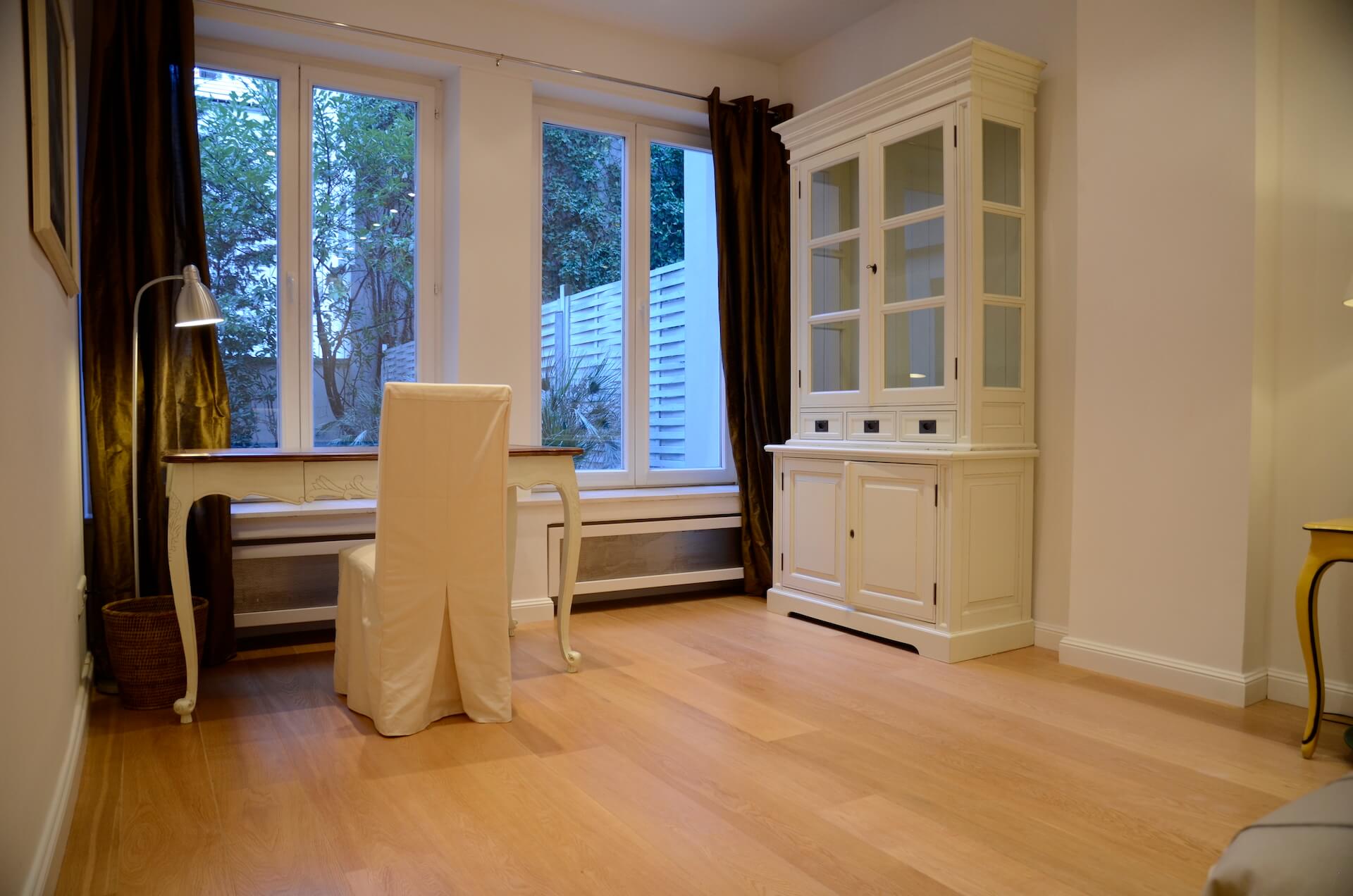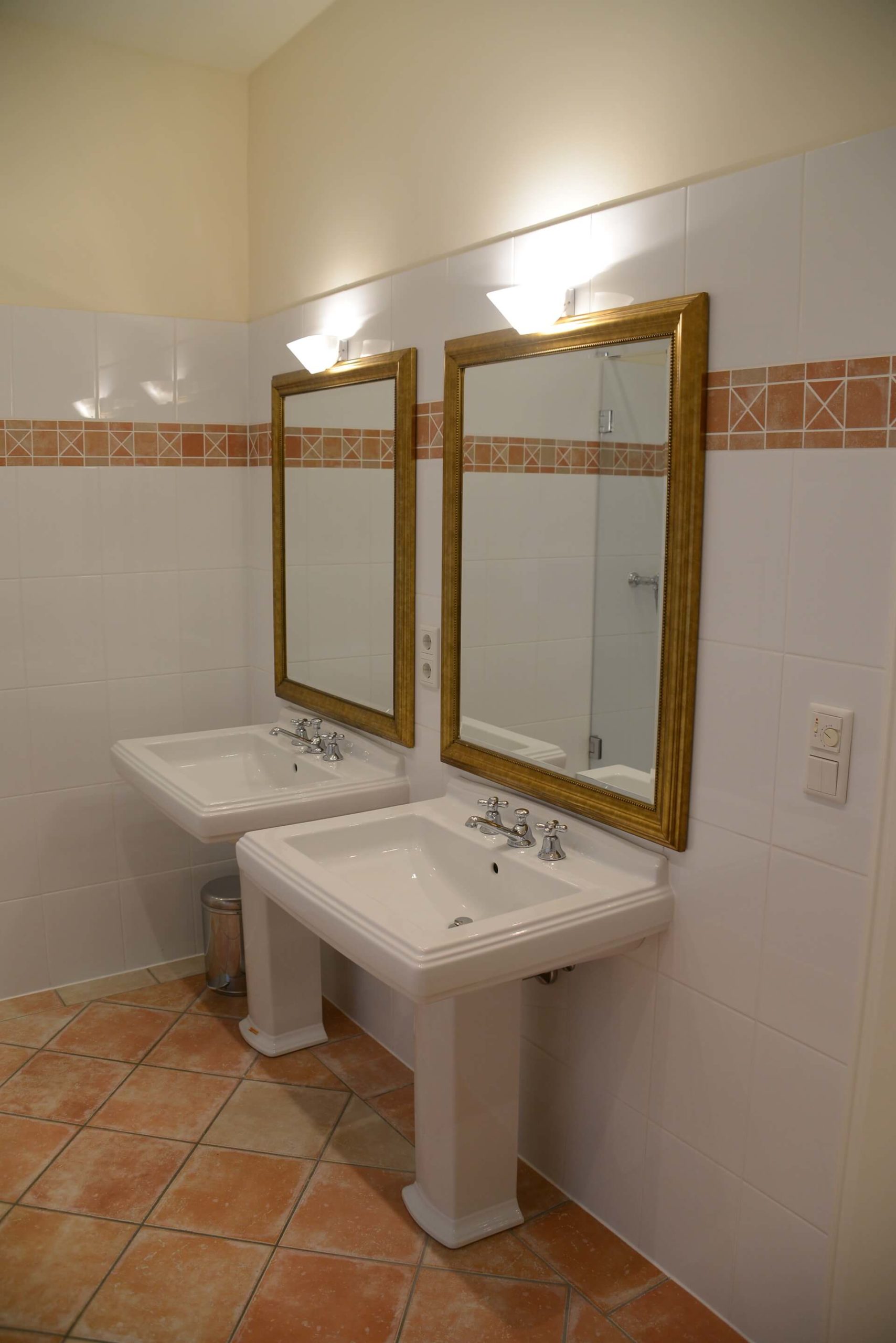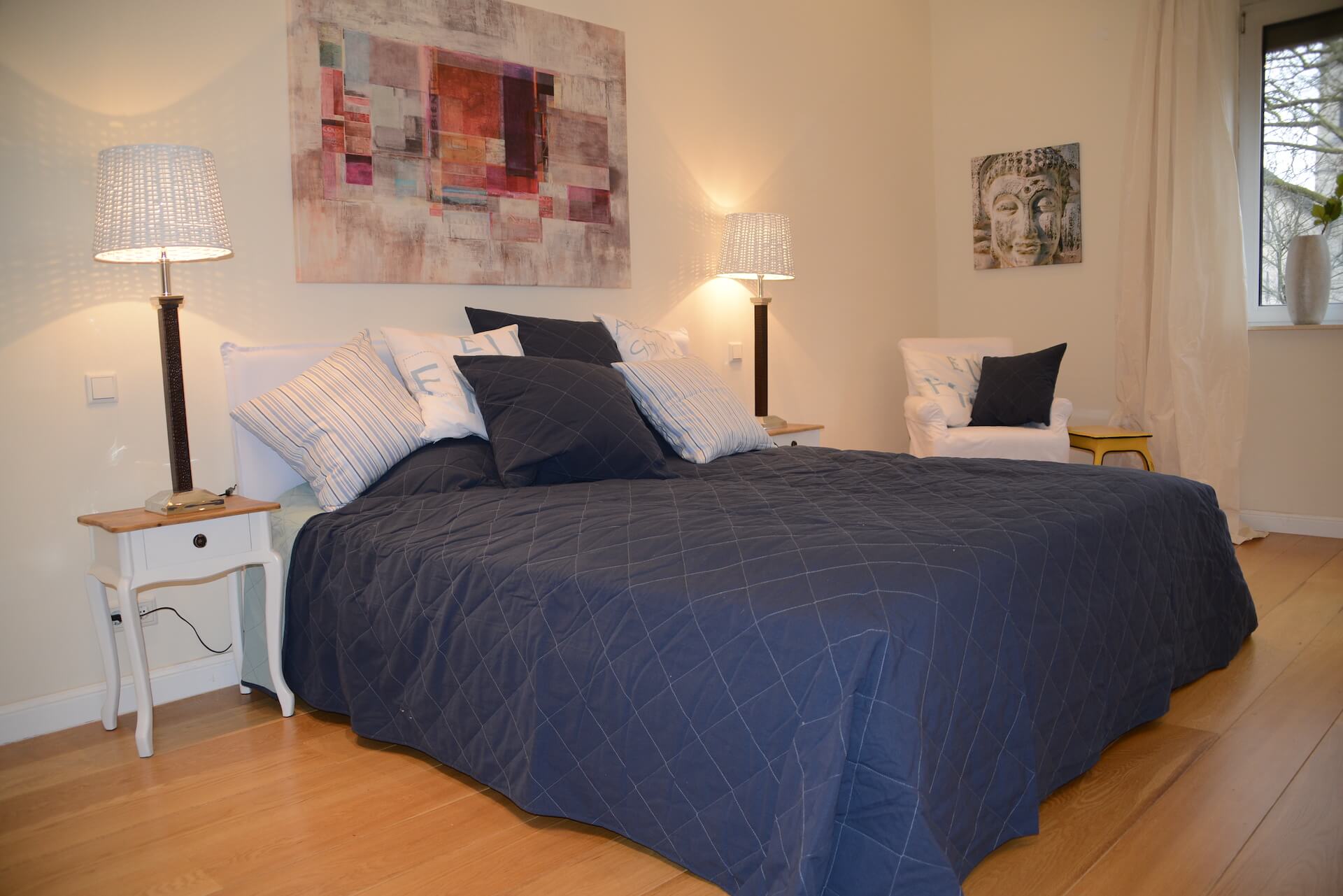 Durch eine große 2-flügelige Tür erreichen Sie von Wohnzimmer aus den Schlafbereich. Vor dem Bad befindet sich ein Ankleidebereich (begehbarer Kleiderschrank), darauf folgt ein großes Bad mit Badewanne, 2 Waschtischen, Dusche und WC. Das Badezimmer ist mit neuen Villeroy & Boch Objekten im Stil der Jahrhundertwende ausgestattet und wirkt sehr edel.