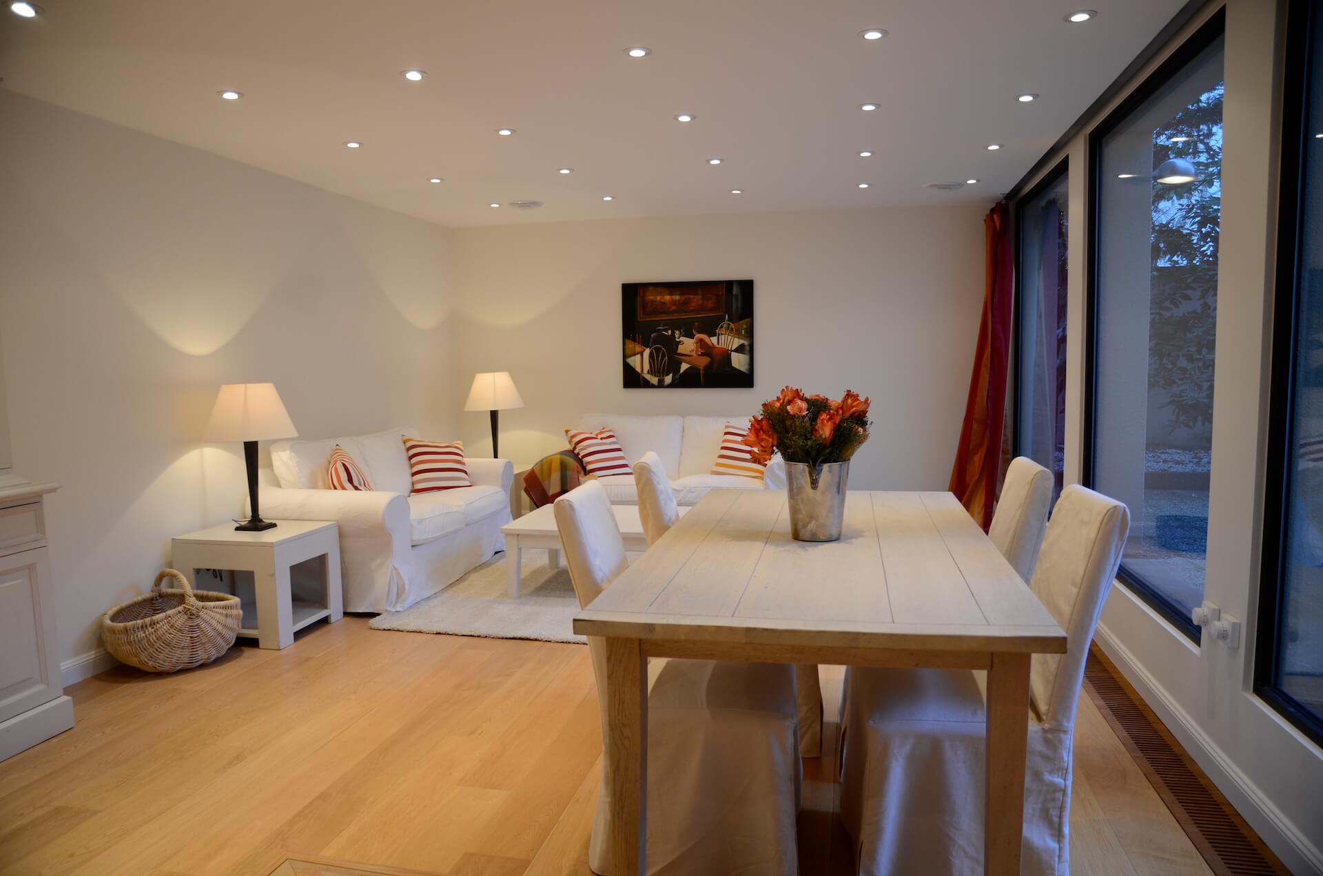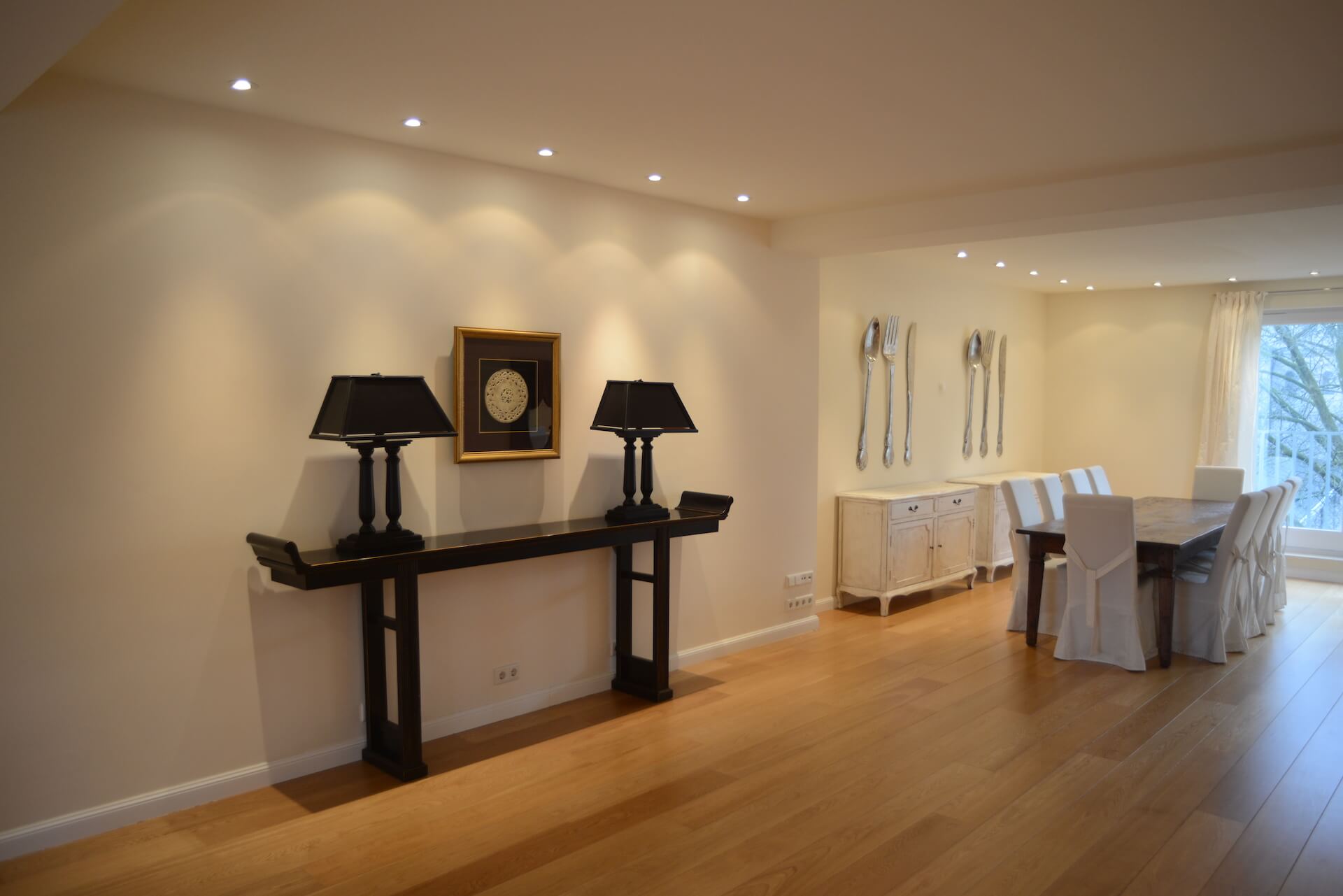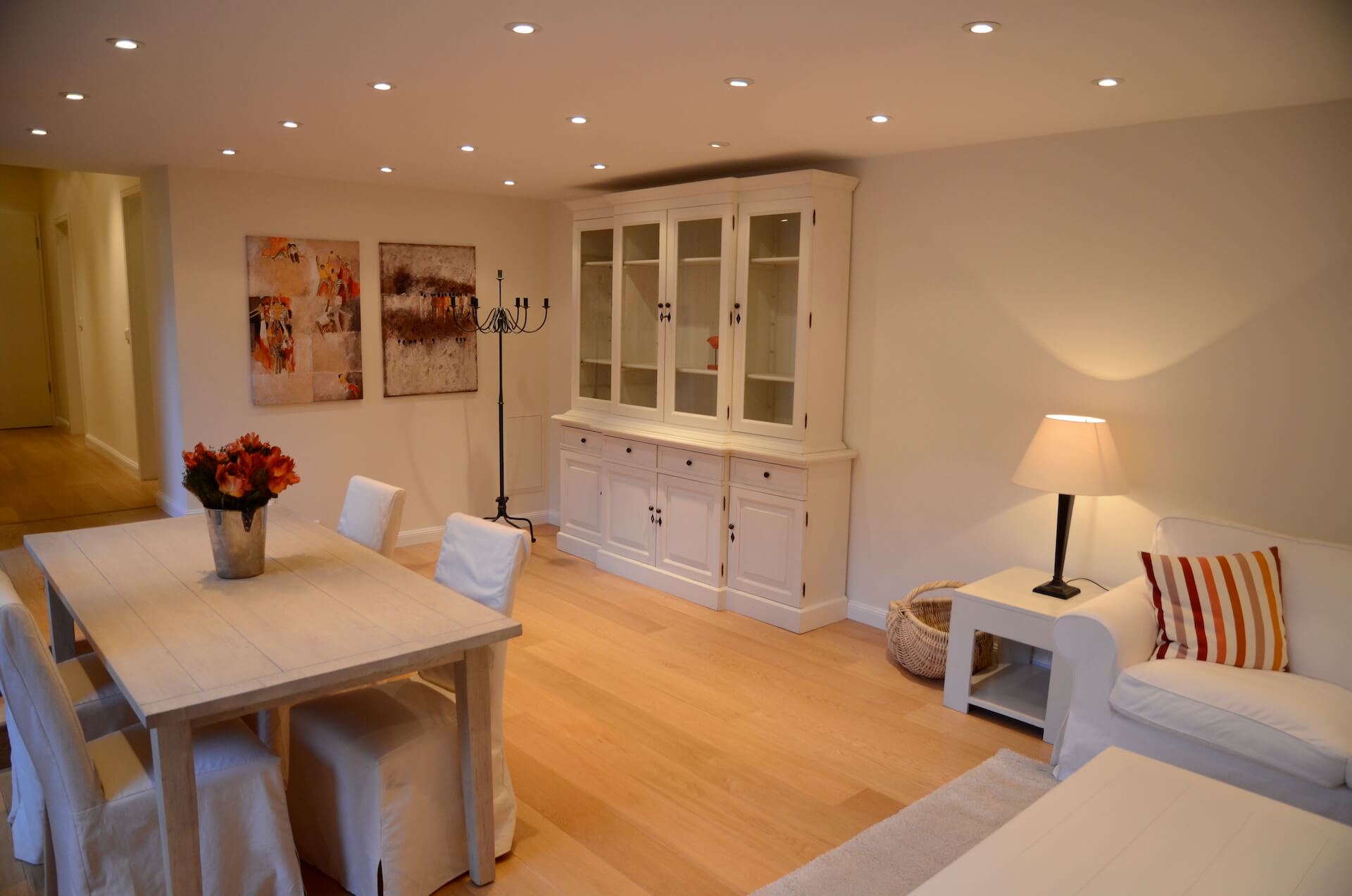 Extrem hohe Decken (3,25m) mit Einbaustrahlern, Echtholz Eichen Parkett/Dielenfußboden mit Fußbodenheizung Gespachtelte Wände, Luxus Einbauküche mit allen Geräten, Terrasse mit Hartholzbelag