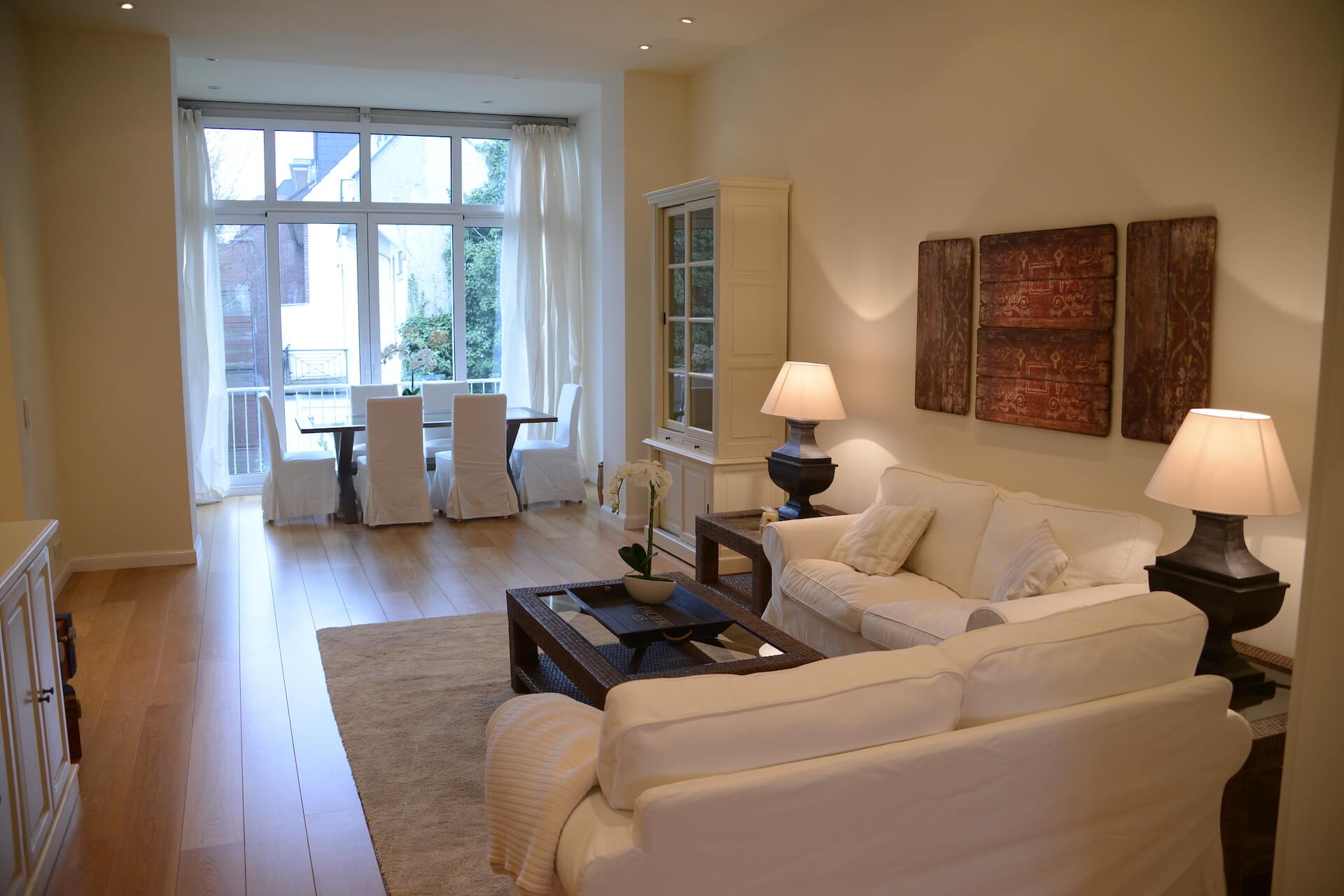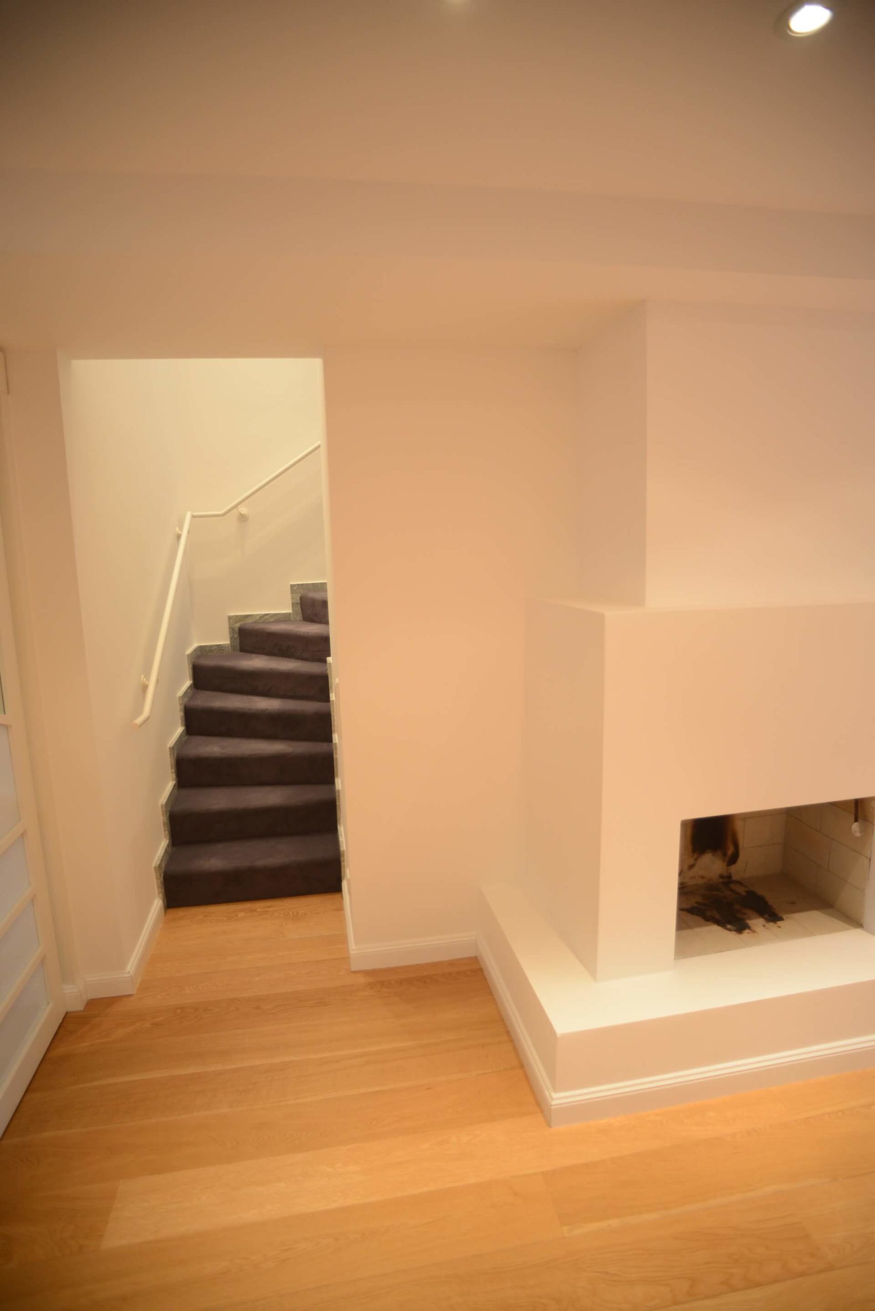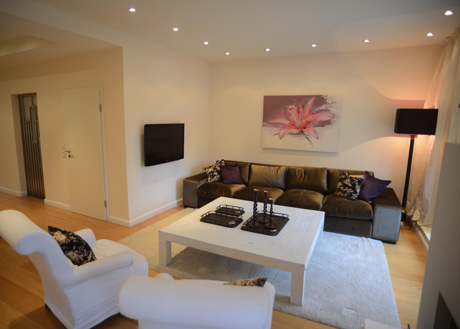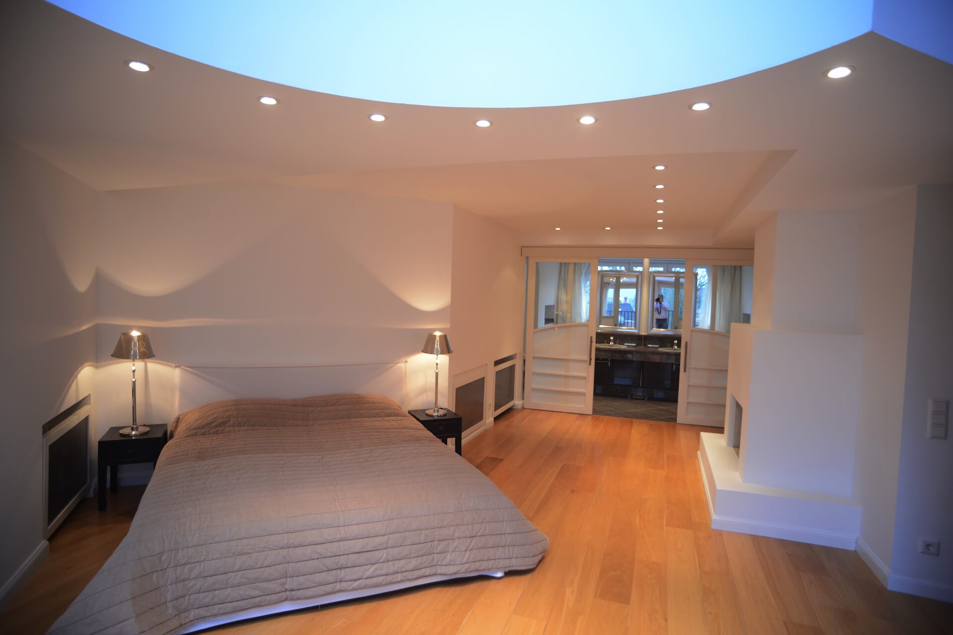 Extrem hohe Decken (3,25m) mit Einbaustrahlern, Echtholz Eichen Parkett/Dielenfußboden mit Fußbodenheizung Gespachtelte Wände, Luxus Einbauküche mit allen Geräten, Terrasse mit Hartholzbelag