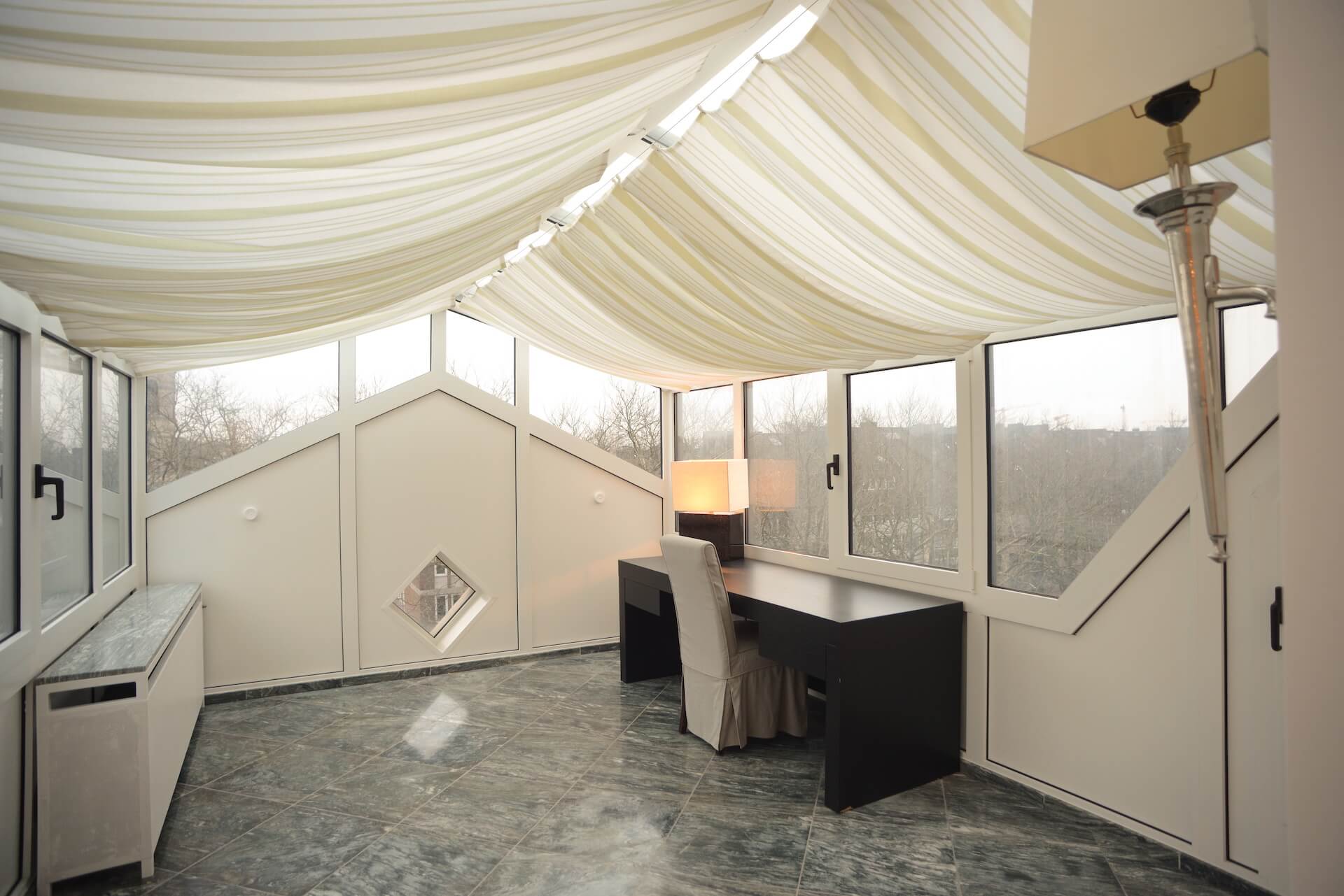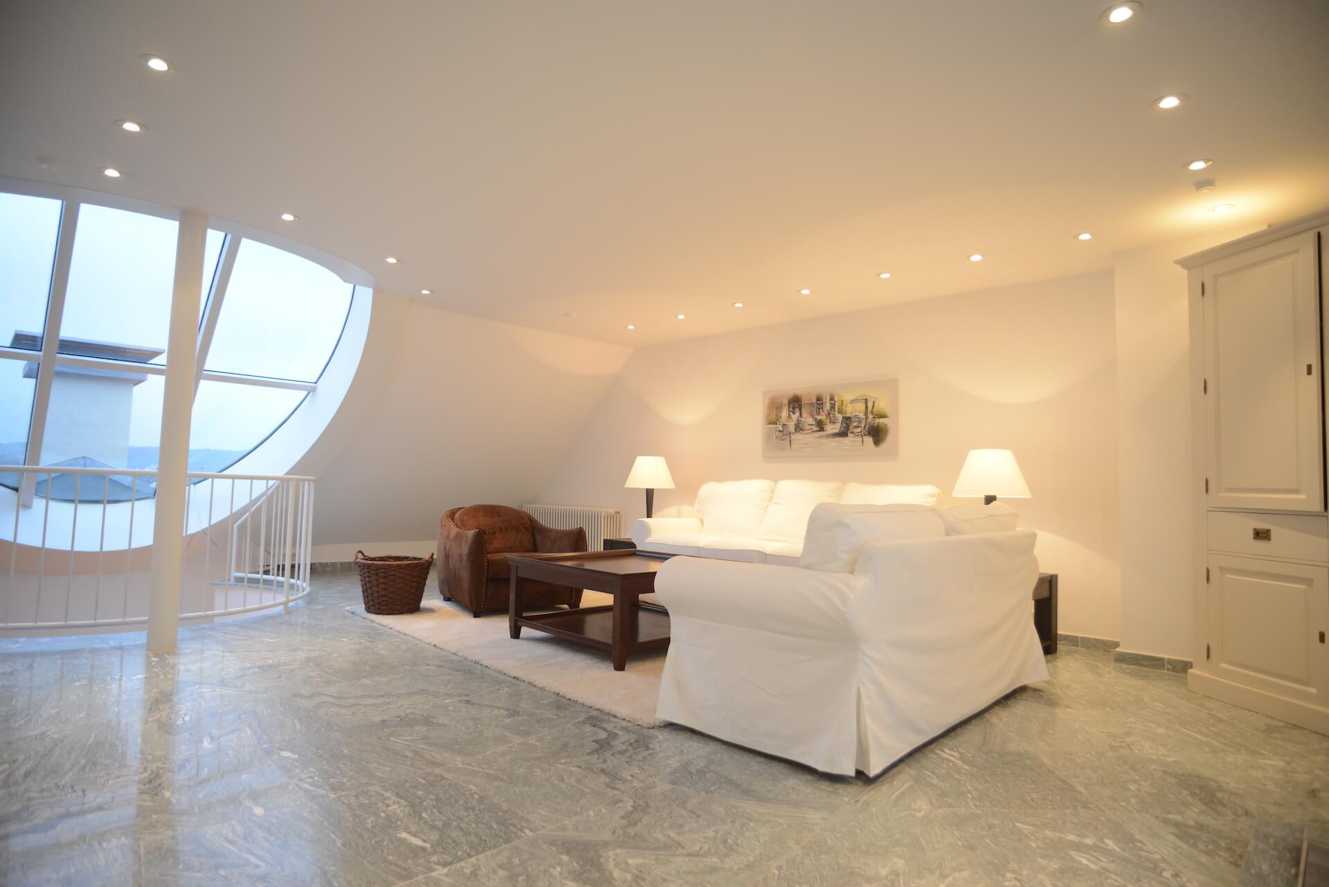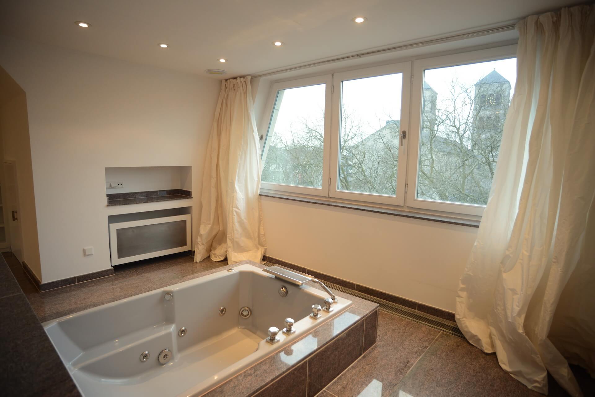 Die Treppe führt Sie weiter in die dritte Ebene der Wohnung, dem Dachgeschoss. Diese ist als Galerie offen gestaltet, mit großen Fensterflächen und einem atemberaubenden Blick über Düsseldorf.