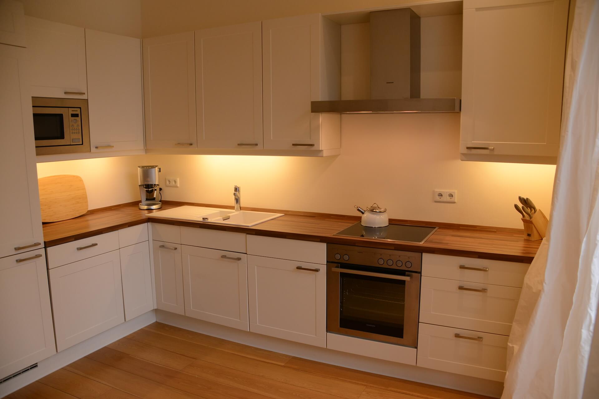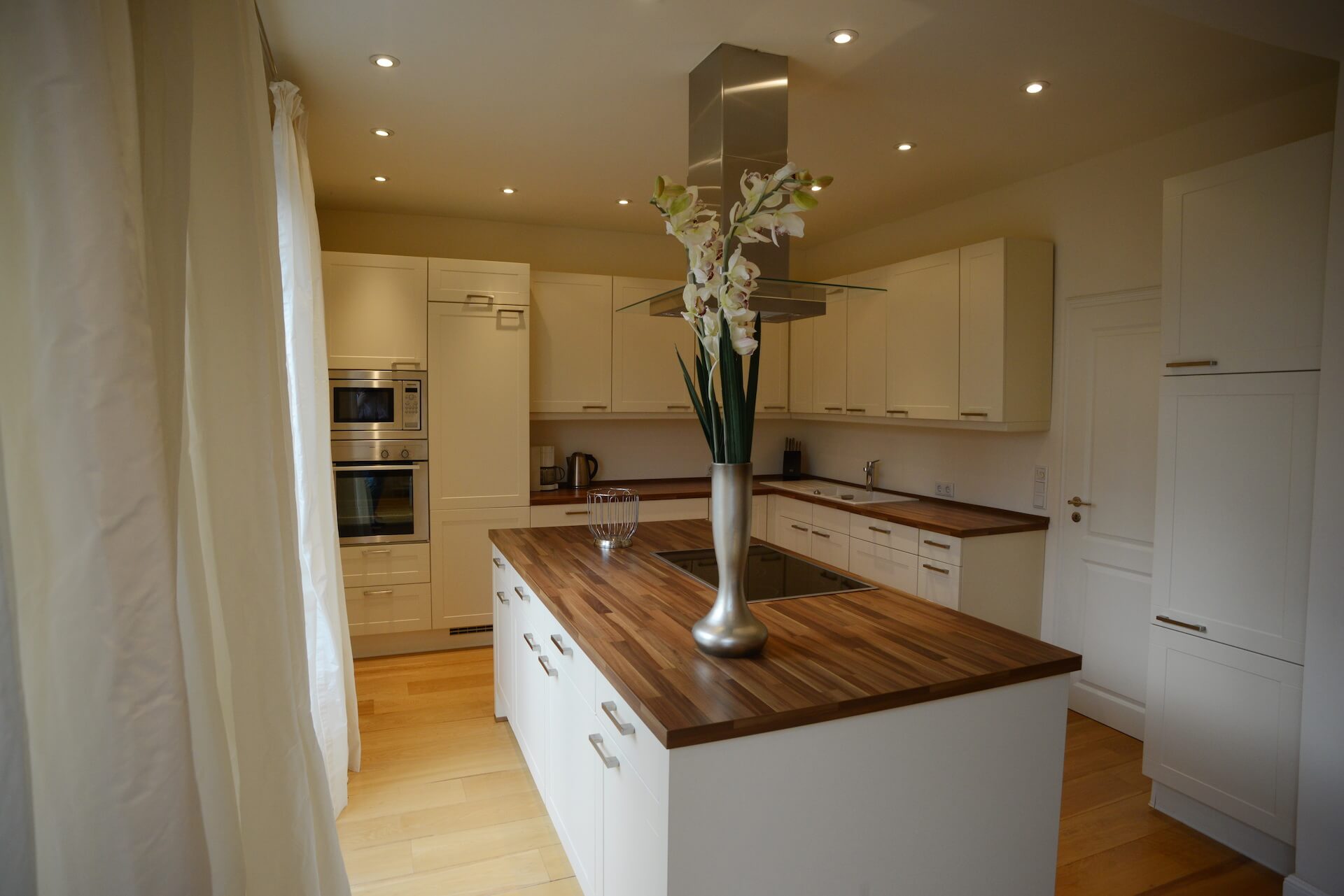 Daran gliedert sich eine Küche mit einer gehobenen-neuen Einbauküche.